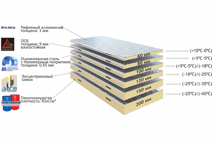 - Толщина сэндвич -панелей ППУ: 60, 80, 100, 120, 150, 200 мм.